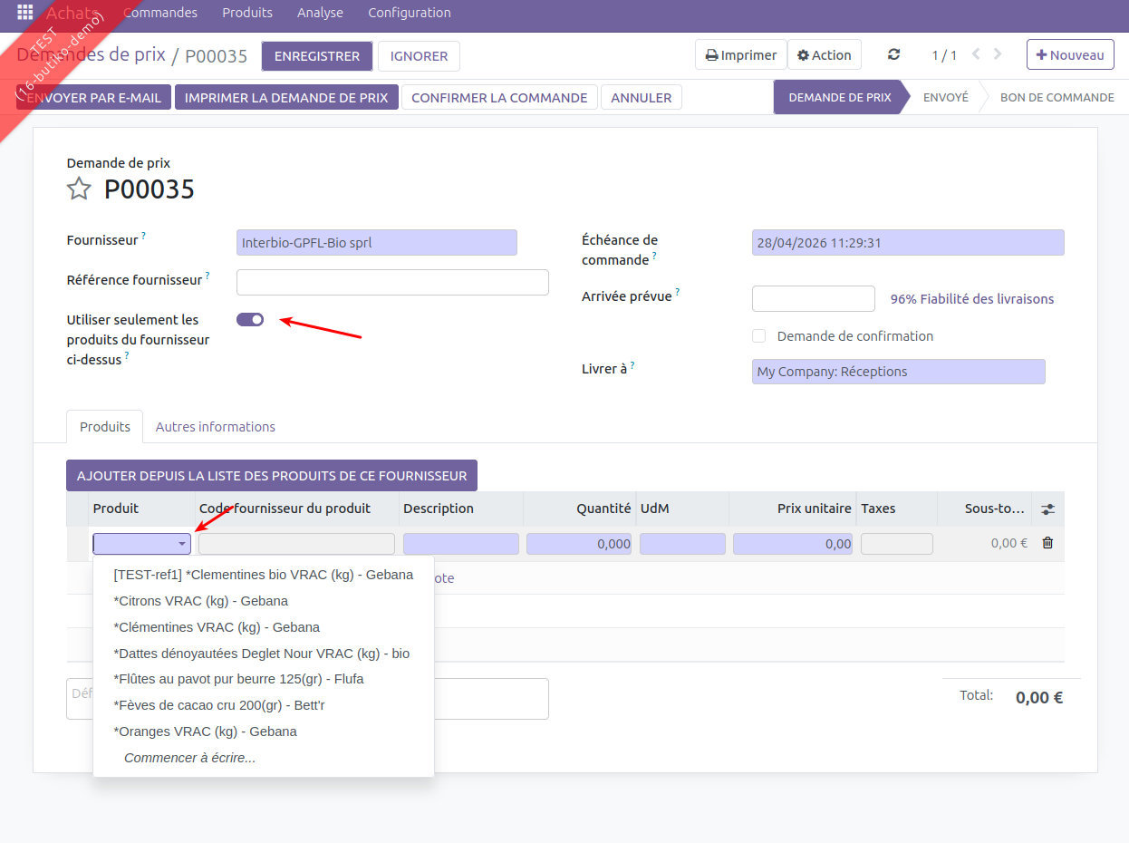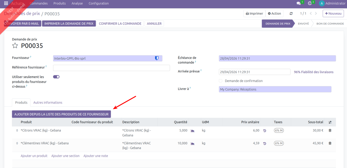 Pour cela, créer une commande fournisseur, ajouter un fournisseur et cliquer sur "Ajouter depuis la liste des produits de ce fournisseur".