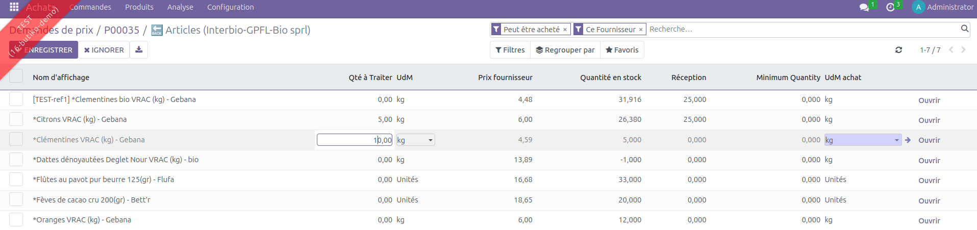 Une liste s'ouvre, avec tous les produits qui sont liés à ce fournisseur. La liste affiche notamment la quantité en stock et l'unité de mesure d'achat et de vente. Il faut encoder la quantité à commander dans la colonne "Quantité à traiter".