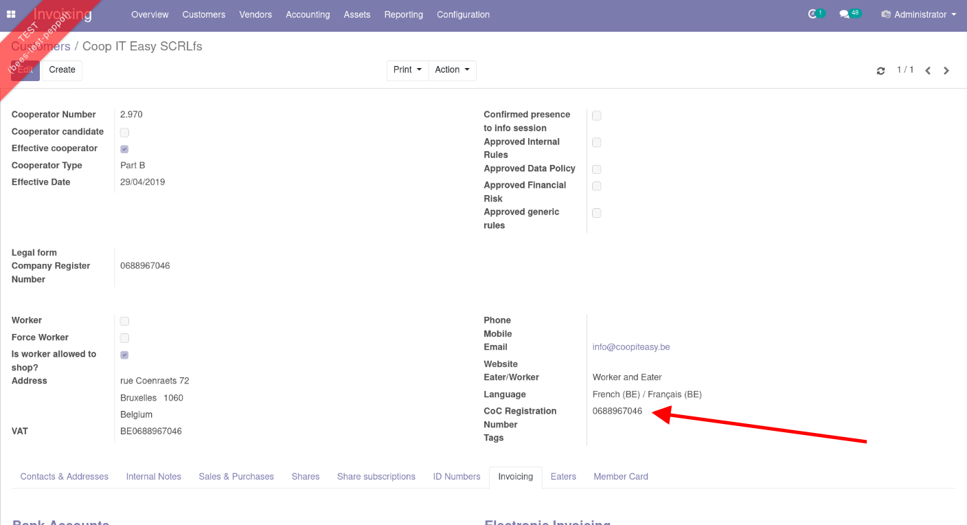 Si le numéro TVA est encodée sur une société belge, un identifiant CoC Registration Number est automatiquement rempli. Ce champs a un but uniquement technique.