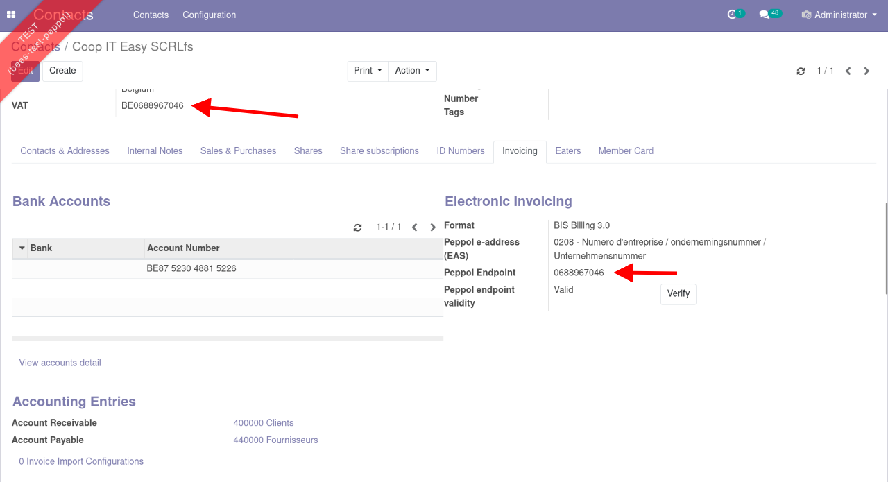 Pour pouvoir configurer Peppol, il faut que le numéro TVA soit définit sur la fiche contact liée à la société. Ceci permettra de calculer votre adresse Peppol (dans l’onglet “Facturation”). Le numéro TVA est utilisé pour définir automatiquement le point d'accès peppol du client.