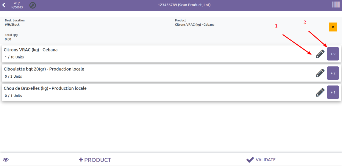 Au 10e scan, la ligne du produit disparait. Les lignes de réception "complètement scannées" sont visible en cliquant sur l’icône d’œil en bas à gauche pour afficher les opérations détaillées. On peut cliquer sur l'icône "poubelle" pour supprimer l'encodage effectué et recommencer à scanner.