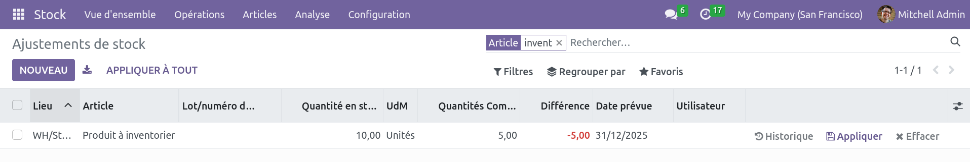 Si le test d'import fonctionne, vous pouvez importer. On voit alors une nouvelle ligne d'ajustement de stock. Vous pouvez soit appliquer cette ligne individuelle (bouton Appliquer à droite de la ligne), soit appliquer tout l'inventaire (Appliquer à tout).