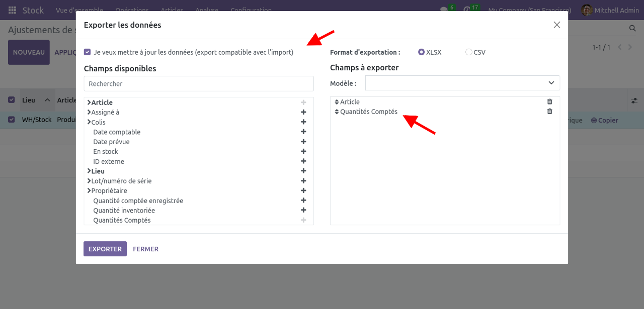 Il faut se rendre dans Inventaire>Opérations>Ajustement de stock. Exporter les lignes correspondantes aux produits que vous souhaitez inventorier.
