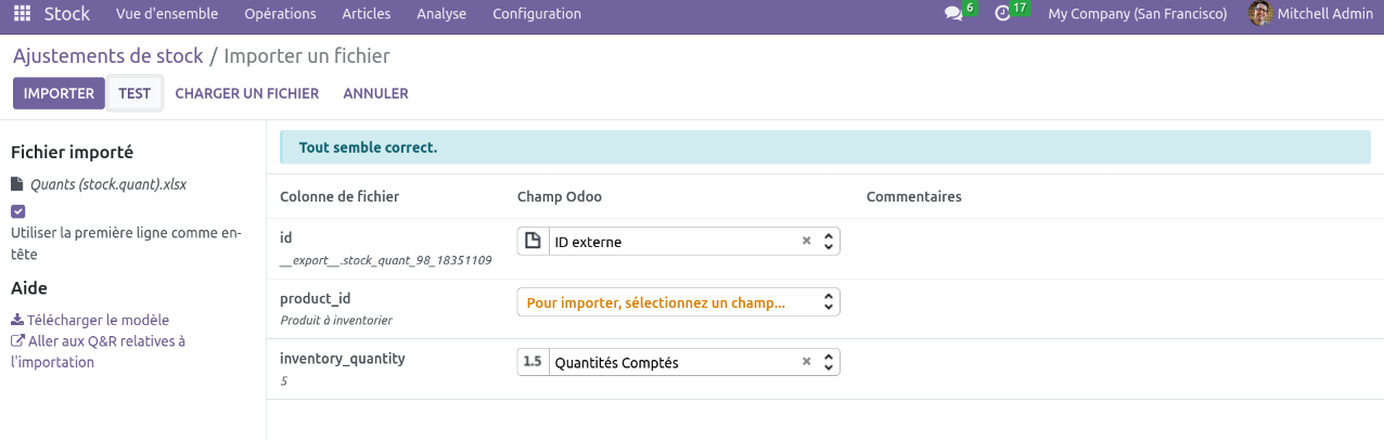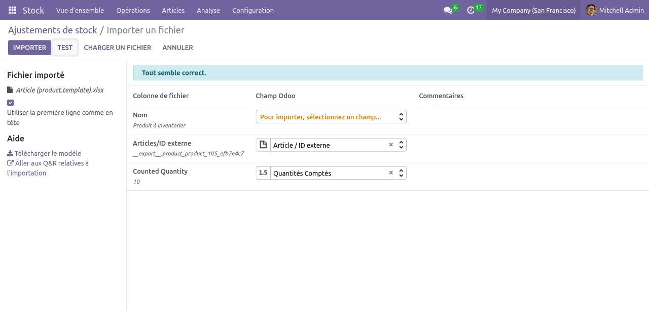 Puis se rendre dans Inventaire>Opérations>Ajustement de stock, puis Favoris>Importer. Charger le fichier excel, les colonnes devraient être automatiquement détectées. La première colonne n'a pas besoin d'être matchées (elle sert juste aux personnes qui ont réalisés l'inventaire).
