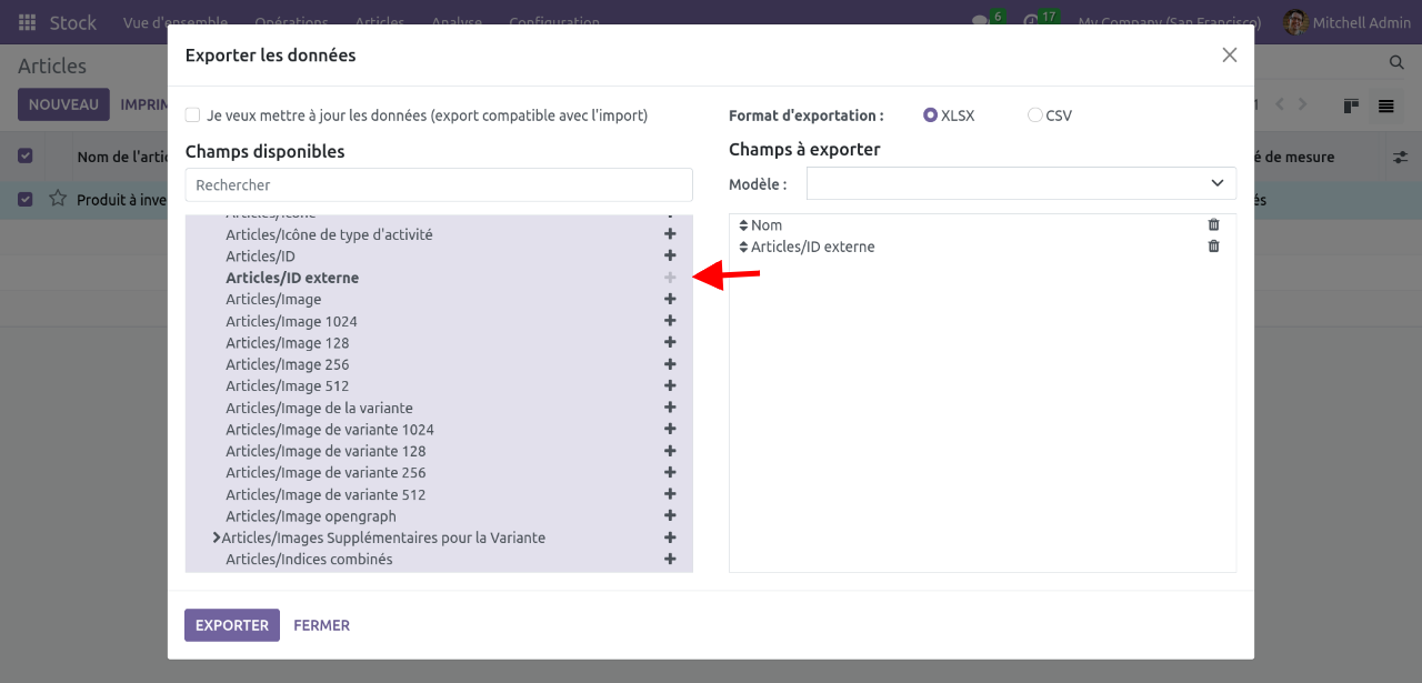 - Exporter tous les ajustements de stocks (cf ci-dessus), mais en incluant l'ID externe des produits (Articles/ID externe)