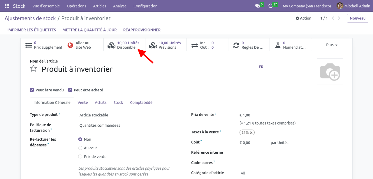 La procédure ci-dessus documente les étapes pour réaliser le premier inventaire dans Odoo. Pour mettre à jour les quantités en stock pour les produits existants, on doit suivre une autre méthode.