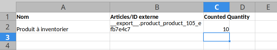 Dans le fichier excel, ajouter une colonne "Counted Quantity" et y encoder les quantités inventoriées.