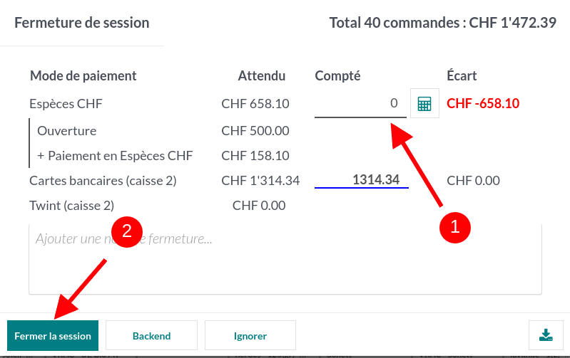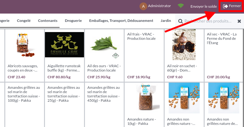 - Depuis l'écran de caisse, cliquez sur "Fermer" en haud à droite (cf. ci-dessus)