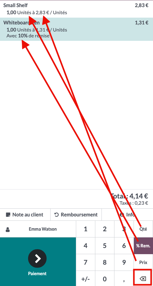 - Par exemple, pour une remise de 10% sur un article, sélectionnez "Rem". puis tapez "10".