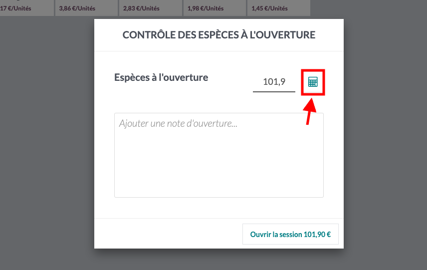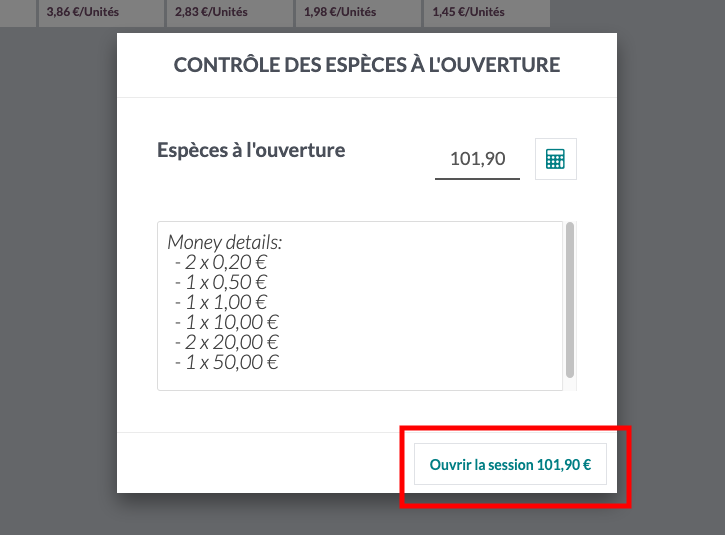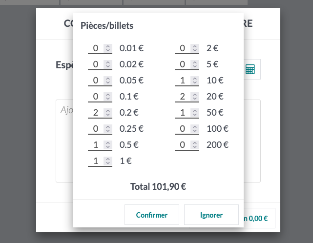 Vous devez vérifier le montant qui se trouve dans la caisse. Il doit correspondre au montant initial qui est inscrit à l’écran (qui reprend le montant encodé lors de la fermeture de la veille). Vous pouvez calculer le montant en détails, via le bouton à droite du montant. Ici, vous pourrez indiquer le nombre de pièces de monnaies et de billets qui se trouvent dans la caisse.