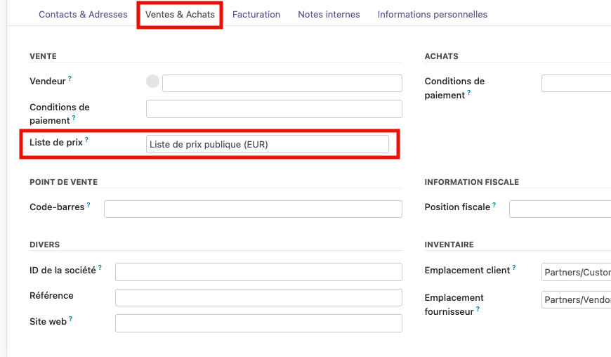 A la création d’un client, par défaut la liste de prix qui s’applique est la liste publique. Il faut changer cette liste sur la fiche contact de ce client pour que s’applique la nouvelle liste de prix.