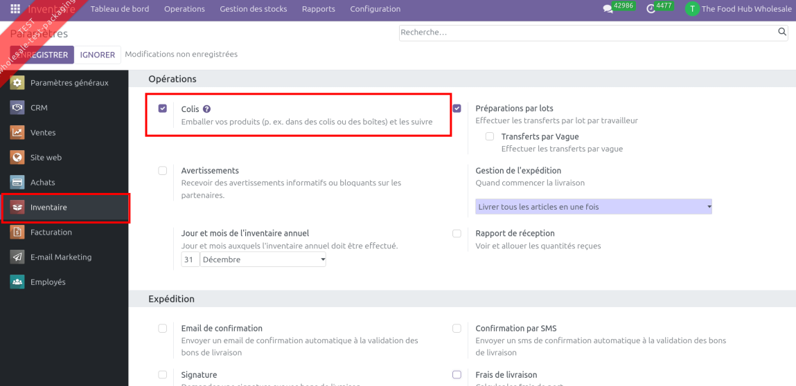 Pour utiliser cette fonctionnalité pour la vente, il faut que la configuration "Colis" soit activée dans Inventaire > Configuration > Configuration :