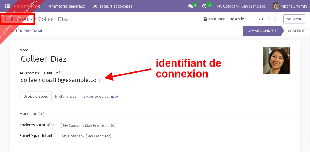 Certains contacts ont un accès au système Odoo, via un compte utilisateur. Le compte utilisateur est soit créé manuellement, soit créé automatiquement si la personne s'inscrit depuis le site web d'Odoo. Dans les deux cas, l'email du contact est utilisé comme identifiant de connexion par défaut de l'utilisateur.