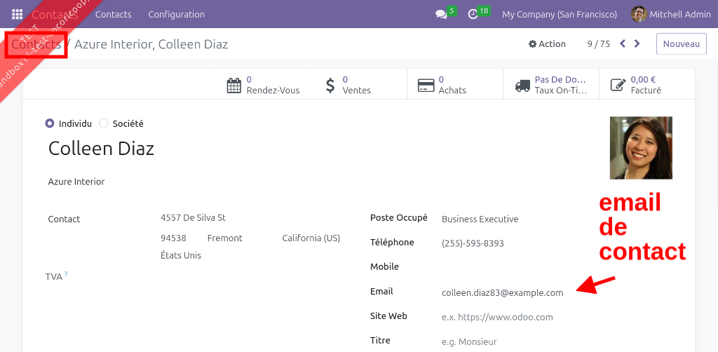 Dans Odoo, les contacts représentent toutes les personnes physiques ou morales en lien avec la société. Cela peut être des clients, des fournisseurs, des partenaires, des coopérateurs, des bénévoles, des employés… Sur les fiches contacts, le champ "Email" permet d'encoder l'email qui sera utilisé pour communiquer avec le contact.