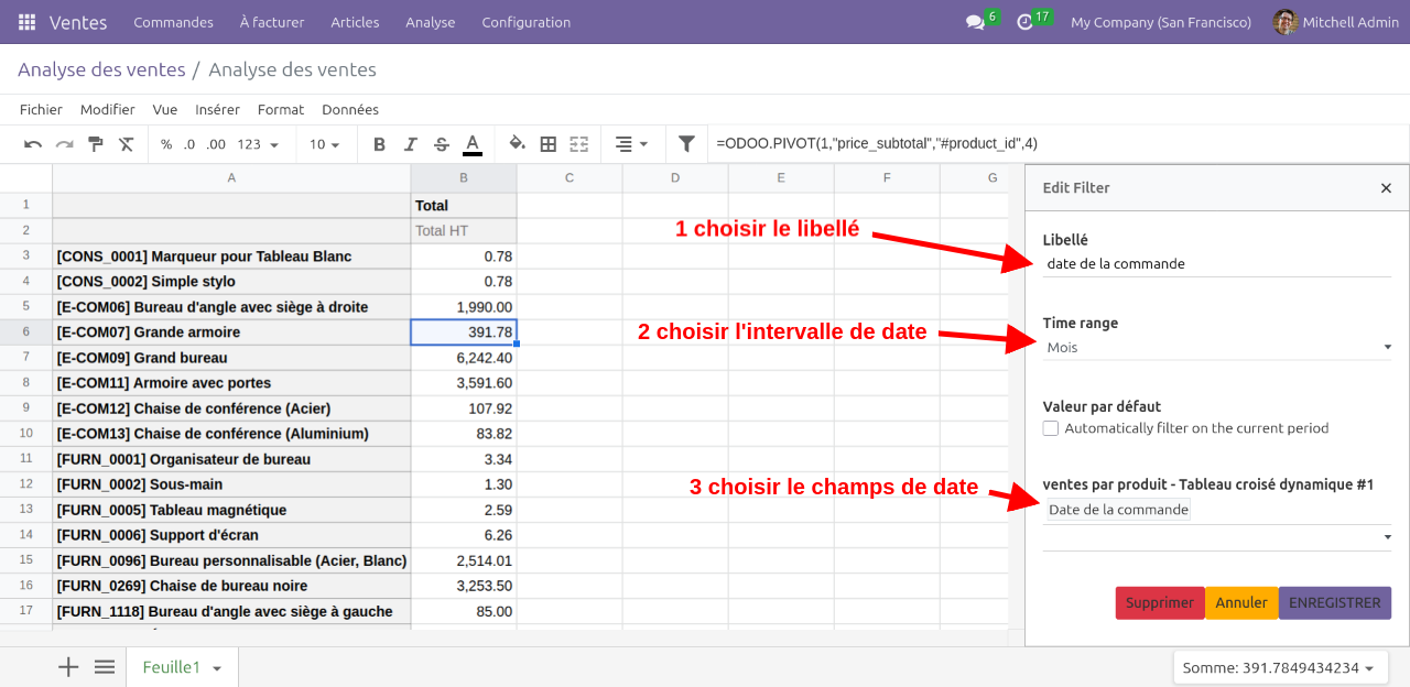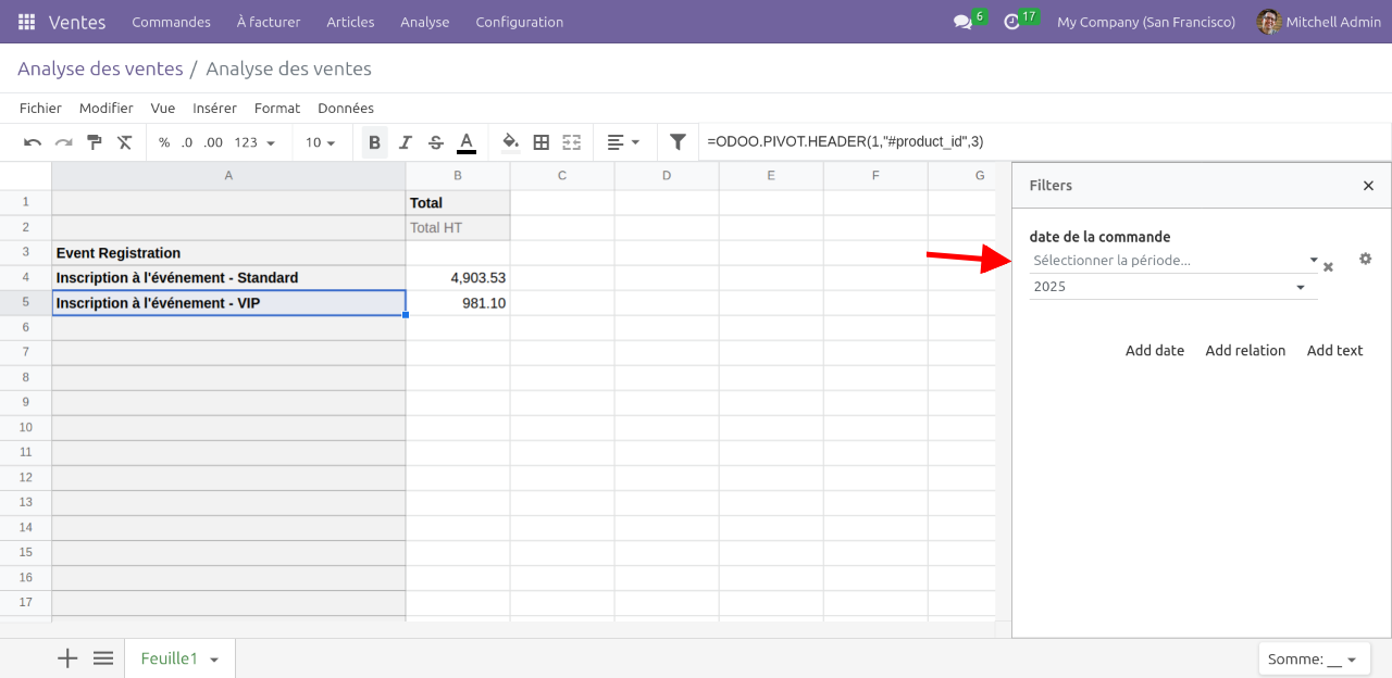 La spreadsheet est créée. On voit que les données affichées sont issues de fonctions Odoo, qui font le lien avec les données de la base de donnée.